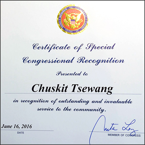 Tsewang Chuskit received a US Congressional Recognition Award from Congresswoman Nita Lowey for her “outstanding and invaluable” service to the community.